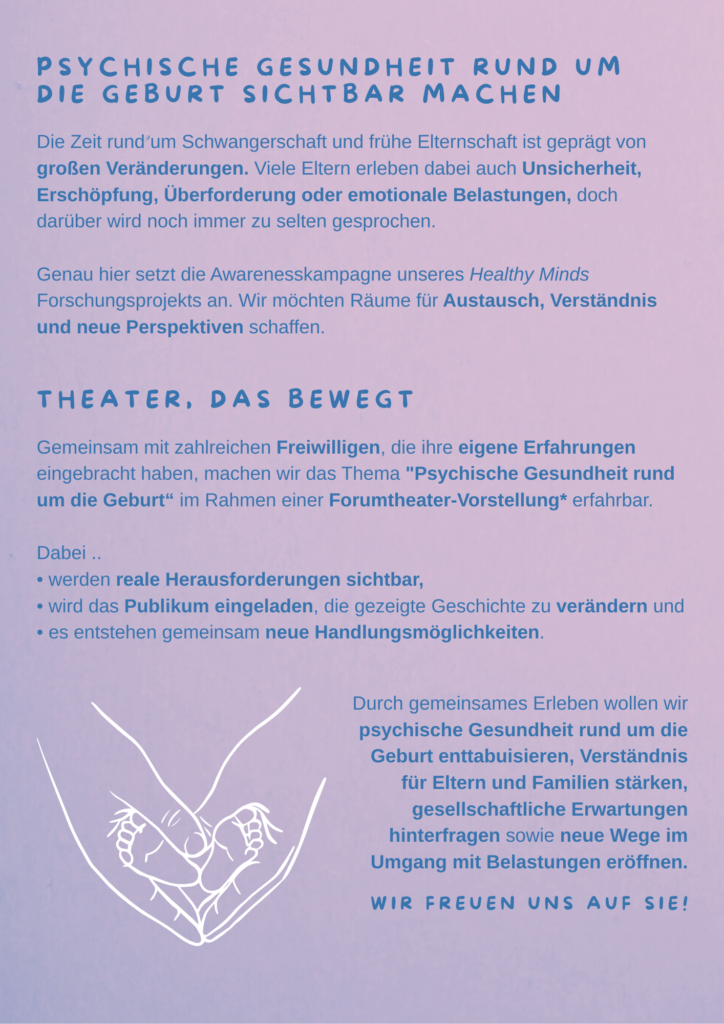 Für uns war klar: Diese Form von Theater macht nicht nur sichtbar, was im Alltag oft unausgesprochen bleibt, sondern sie lädt dazu ein, sich einzumischen, mitzudenken und neue Handlungsspielräume gemeinsam auszuloten. Daher möchten auch wir das Konzept in unsere Awareness-Kampagne integrieren und zu der Entwicklung eines Stücks zum Thema “Perinatale psychische Gesundheit” einladen!