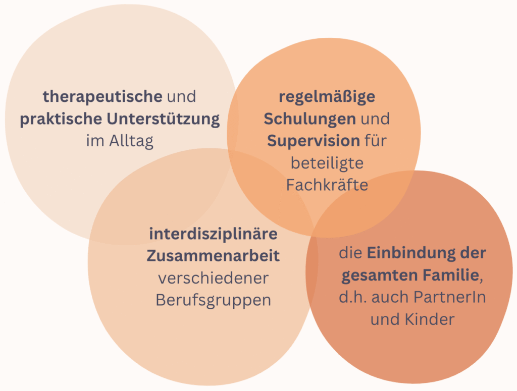 Im Rahmen ihrer Masterarbeit hat eine Projektmitarbeiterin ExpertInnen aus Psychologie, Medizin, Geburtshilfe, Pflege und Sozialarbeit befragt, um zentrale Elemente eines wirksamen Home-Treatment-Modells für Tirol zu identifizieren. Die Ergebnisse zeigen, dass ein erfolgreiches Programm flexibel, bedarfsorientiert und familienzentriert gestaltet sein muss. Dazu gehören u.a.: