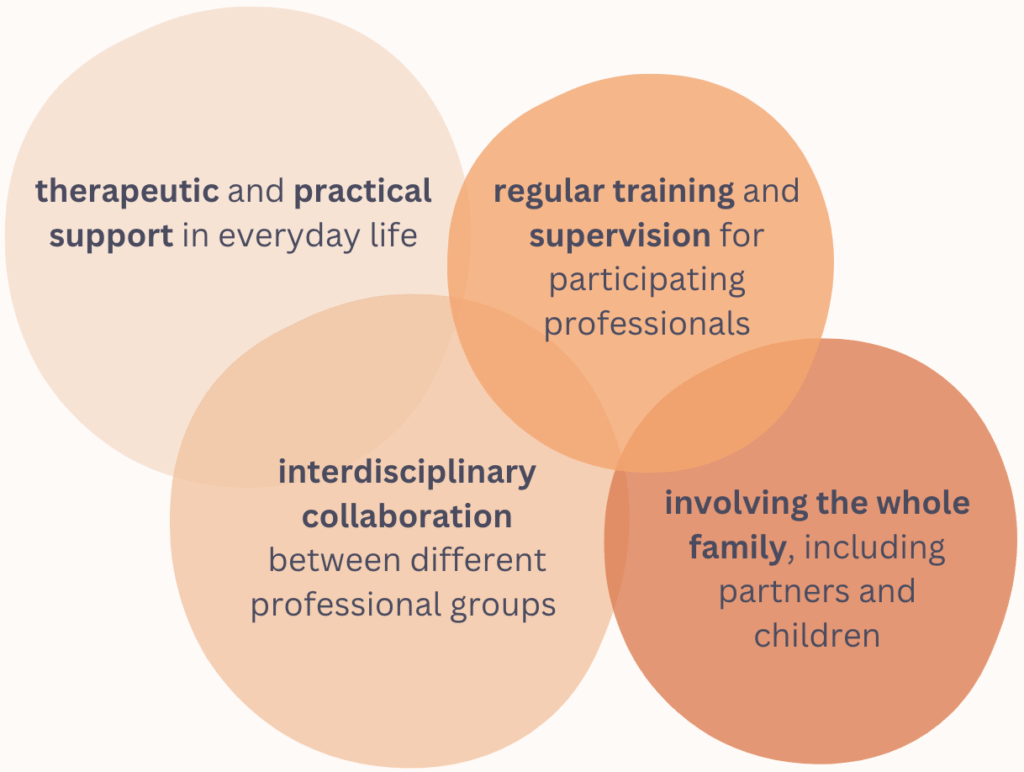As part of her Master’s thesis, one of our project team members conducted interviews with experts from psychology, medicine, midwifery, nursing, and social work to identify the key elements of an effective Home Treatment model for Tyrol. The results show that a successful program must be flexible, needs-based, and family-centered. This includes, among others: